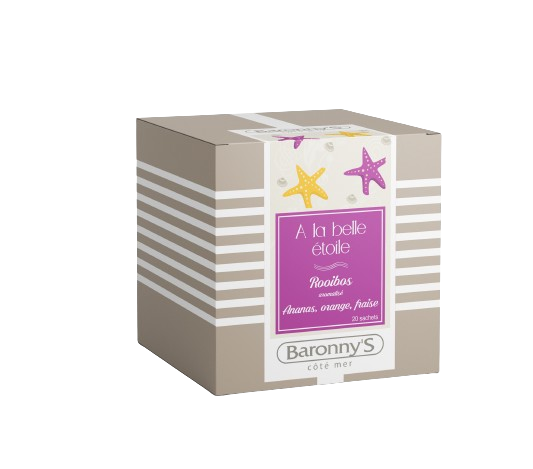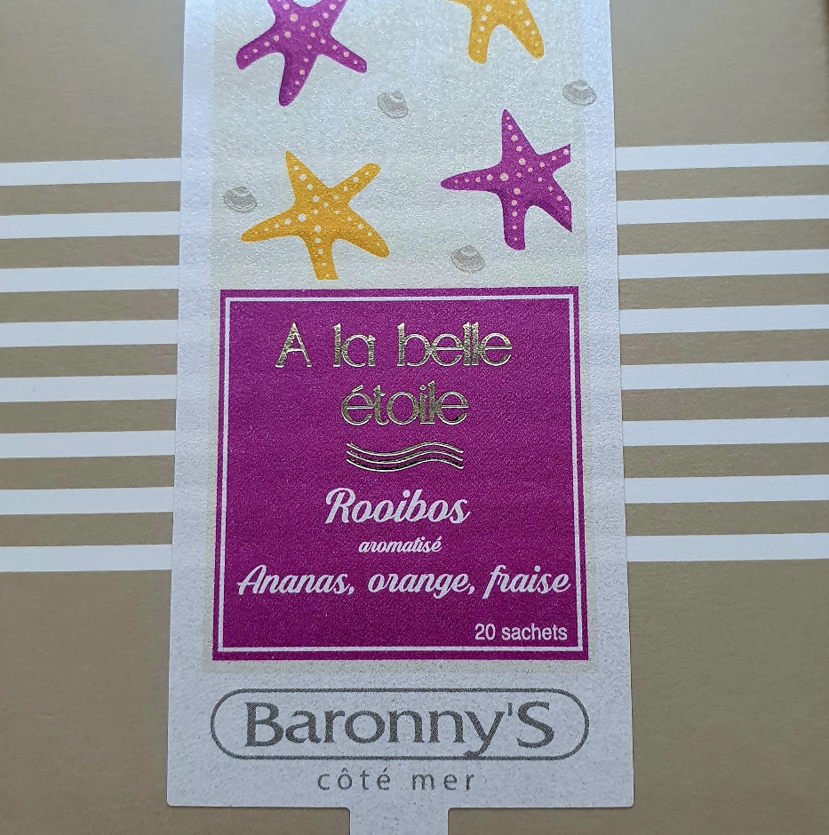 Rooibos, ananas, arôme, oranges, fleurs de souci, fraises, fleurs de bleuets.