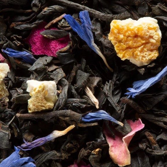 Thés noirs de Chine parfumés aux huiles essentielles de citron jaune et citron vert, agrémenté d’écorces d’orange et de fleurs