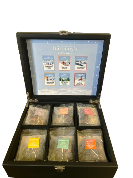 Vous trouverez dans cet élégant coffret bois laqué noir « COFFRET RELAX »  48 sachets: 5 tisanes et 1 rooibos.