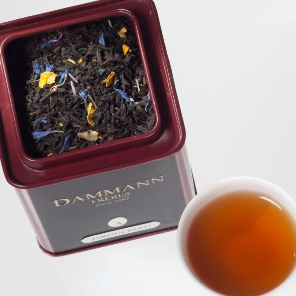 Thé noir parfumé « Jardin bleu » aromatisé à la rhubarbe et à la fraise et fraise des bois le tout parsemé de pétales de fleur. Vous obtiendrez une liqueur parfumée à peine sucrée qui vous envoutera.