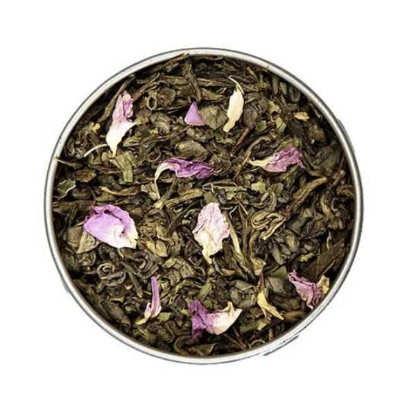 Mélange de thé vert  Sencha et de Gunpowder aromatisé à la menthe Nanah du Maroc et à la rose.