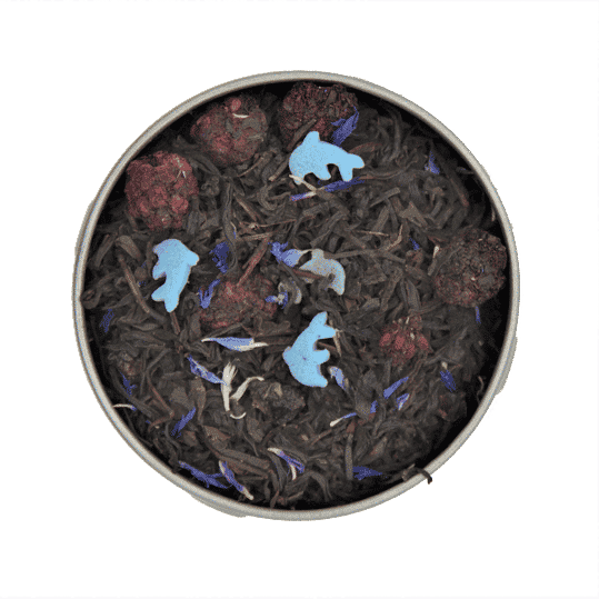 Thé noir aux fruits noirs et rouges, et parsemé de petits dauphins bleus.