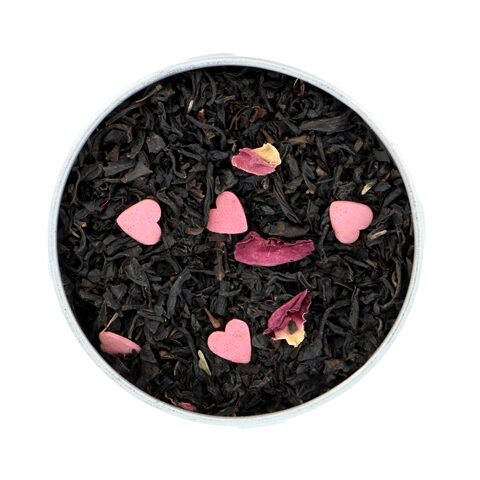 Thé noir parfumé aux fruits rouges, litchis, et pétales de roses. Le tout parsemé d’adorables petits coeurs roses.