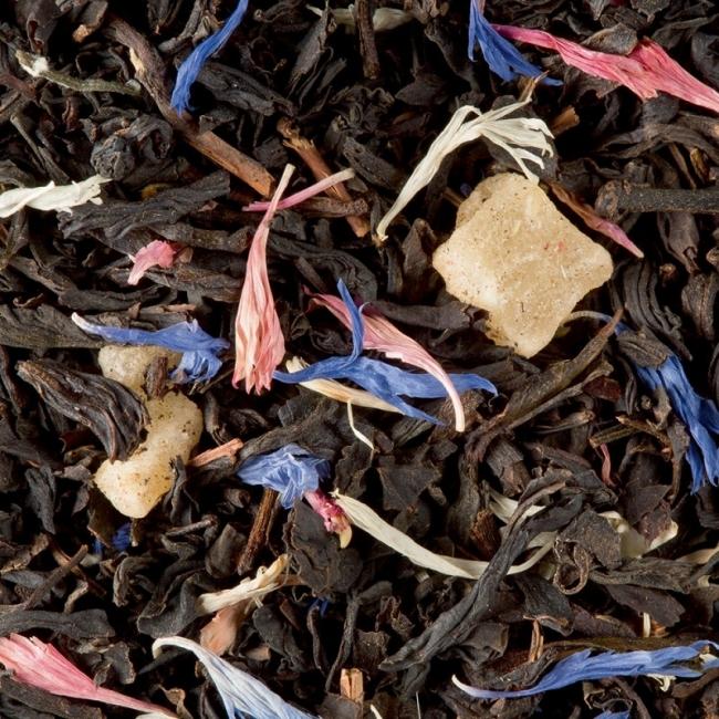 Thé noir de Chine. Richesse des senteurs dans ce mélange d’arômes de fruit de la passion, pêche de vigne et fraise des bois. Agrémenté de morceaux de fruits, parsemé de fleurs de bleuet multicolore.