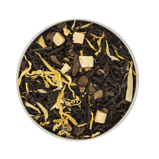 Thé noir parfumé au goût tiramisu composé de café et chocolat avec morceaux de caramel et parsemé de pétales d’hélianthe.