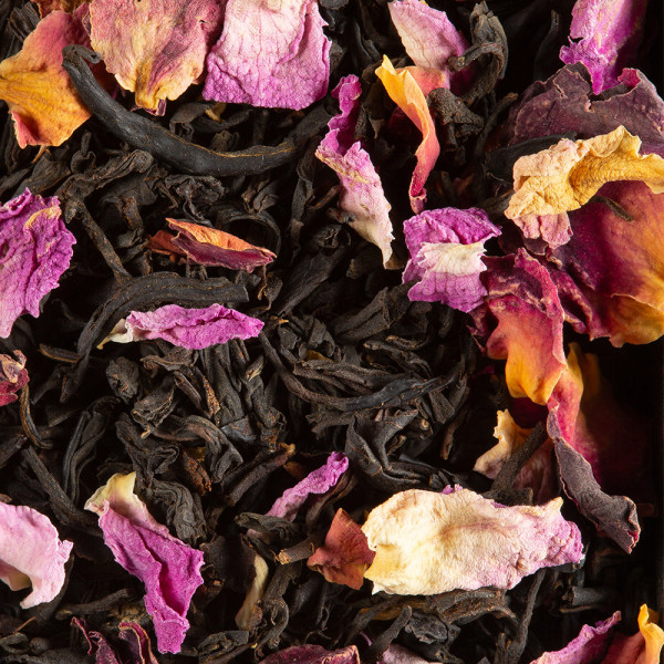 Thé noir de Chine aux arômes de pêche de vigne et de vanille, parsemé de morceaux de fruits et de pétales de roses rouges.