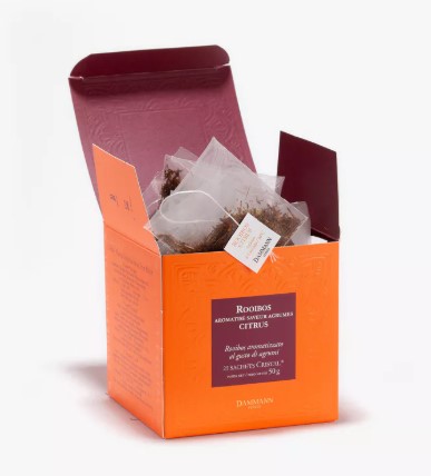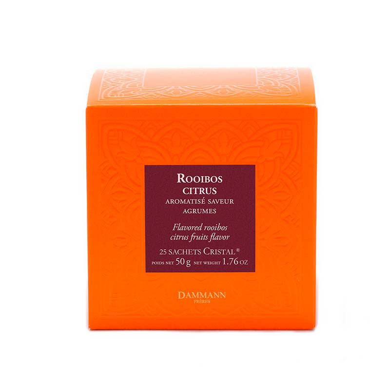Boîte de 25 sachets Dammann composé d’un rooibos aux écorces d’orange et d’huiles essentielles de citron vert, de clémentine et d’orange sanguine parsemé de pétales de fleur.