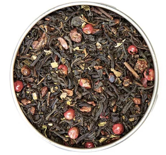 Thé noir aux éclats de fèves de cacao, de morceaux de fraises parsemé de baies roses.