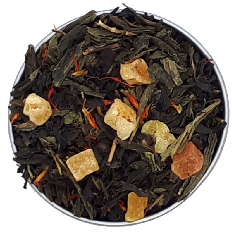 Thé vert parfumé aux fruits rouges, fruits exotiques et pamplemousse.