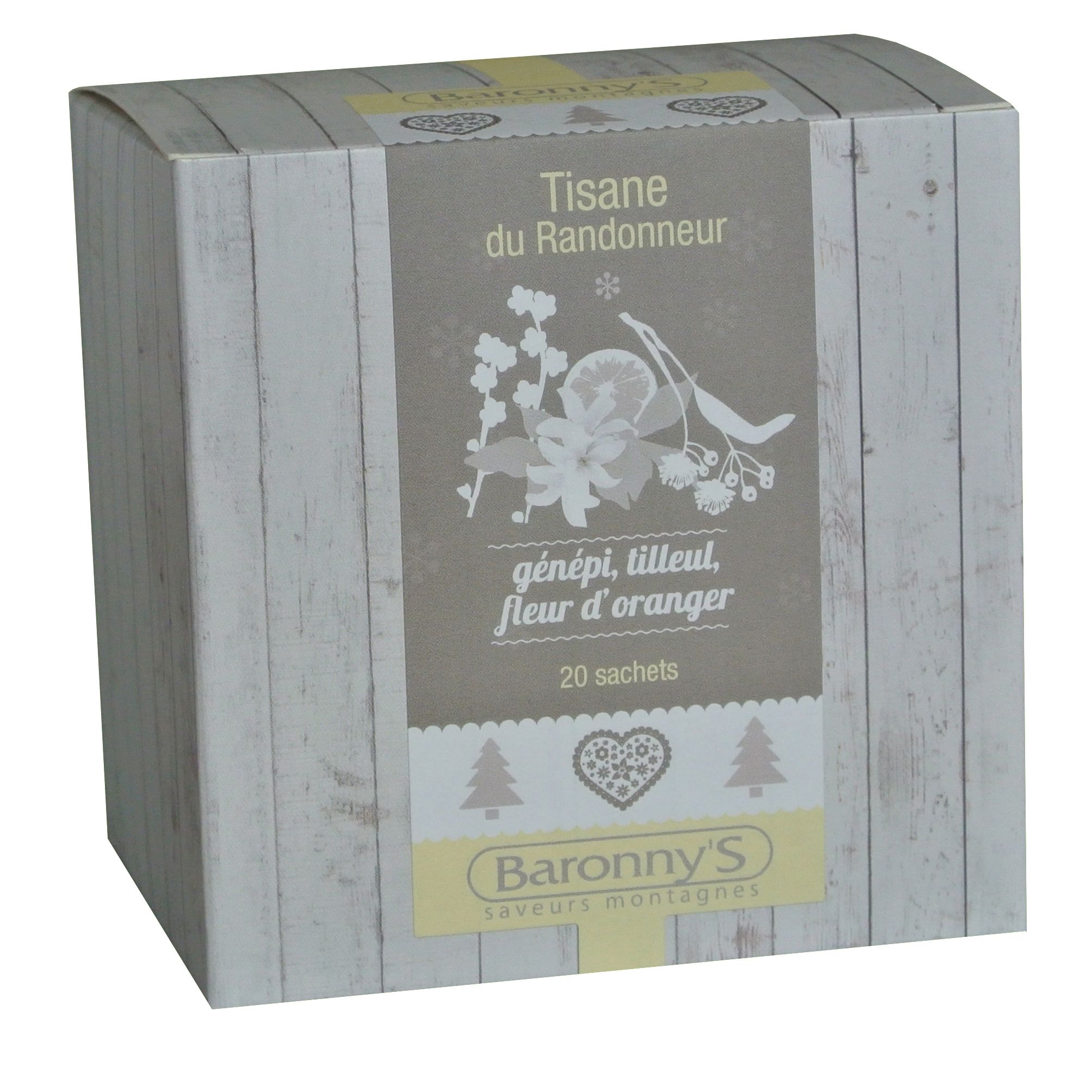Feuilles de mûrier, pomme, verveine, camomille, tilleul, feuilles d’oranger, feuilles de génépi, ananas, arôme.