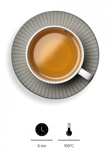 Bergamote, kiwi, pêche jaune, fleur d’oranger, fleur de violette, toutes ces senteurs et saveurs cultivées avec soin et gourmandise depuis le XVIIe siècle dans les jardins de Versailles. Ces saveurs associées à la verveine et au tilleul, nous offrent une tisane agréablement parfumée où, notes végétales, fleuries et fruitées se mêlent dans une royale infusion.